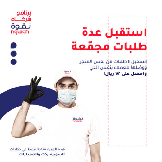 مثلاً : استقبل 4 طلبات من نفس المتجر ووصلها للعملاء بنفس الحي واحصل على ٧٢ ريال